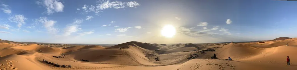 Merzouga es una pequeña ciudad situada al borde de Erg Chebbi, en el desierto del Sáhara. Esta ciudad se encuentra a sólo 50 km de la frontera con Argelia, donde termina la tradicional carretera asfaltada y comienzan las increíbles dunas del desierto del Sáhara. El desierto de Merzouga es uno de los puntos más habituales de haimas y excursiones en camello en Marruecos. La excursión compartida de 3 días de Marrakech a Merzouga es una de las más codiciadas excursiones al desierto desde Marrakech.